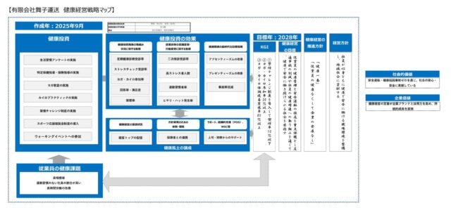 健康経営で解決したい、健康上の課題、期待される効果、具体的な取組みの繋がりをまとめて健康経営戦略マップを作成榮、健康経営に取り組んでまいります。