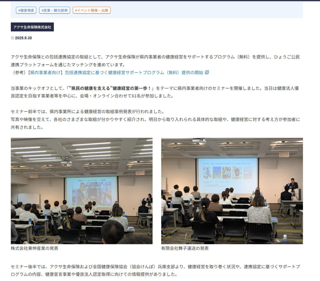 1. 令和6年9月3日(火)14:00より、アクサ生命保険株式会社主催の「健康経営セミナー」において、ブライト500認定取得を目指す講演を行いました。