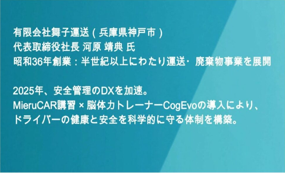 社員の脳体力強化・維持のために導入しているMieruCar講習×脳体力トレーナーCogEvoを実践するにあたって、「導入背景」「運用の実際」「事例から得た気づき」「コミュニケーションの変化」などをインタビューされた動画を実践事例として紹介していただきました。